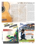 Où que vous soyez dans la Vallée-de- la-Gatineau, vous retrouverez la chaleur des musiciens d’ici qui, sans tambours, ni trompettes, imprègneront en vous, le goût du beau. Tout le Cahier de la Bonne Chanson peut y passer en une soirée. Les musiciens d’ici chantent en français, en anglais et en algonquin. Parce que la mu- sique rejoint tout le monde, peu importe les convictions politiques ou sociales. Les gens de toutes les confessions reli- gieuses font un acte de foi en faveur de la musique à tous les temps. La musique rassemble, regroupe. Elle incite aux nou- velles connaissances et parvient même à tisser des liens d’amitié solides. Et arrive même au chuchotement amoureux dans les buissons. On se souvient toujours d’un moment de bonheur et la musique est un moyen d’évasion plus fort que toutes les
