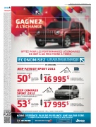 « Moins d’essence. Plus de puissance. Une valeur sûre. » est une comparaison entre les gammes complètes 2012 et 2011 de Chrysler Canada. L’a rmation 8,1 L/100 km ou moins est basée sur les estimations de consommation de carburant sur autoroute du programme ÉnerGuide 2012. Les méthodes d’essai utilisées sont celles de Transport Canada. La consommation d’essence réelle de votre véhicule peut varier selon vos habitudes de conduite et d’autres facteurs. Voyez votre concessionnaire pour des précisions supplémentaires sur le programme ÉnerGuide. Le consommateur avisé lit les petits caractères : ‡, Ω, ± Les o res de cette annonce s’appliquent à la livraison au détail des modèles neufs sélectionnés entre le 1er et le 31 août 2012 auprès des concessionnaires participants et peuvent être modifiées ou prolongées sans préavis. Le transport (1 595 $) et la taxe sur le climatiseur (le cas échéant) sont compris dans le prix d’achat. Aucuns frais supplémentaires ne seront ajoutés aux prix tout inclus des véhicules annoncés. L’immatriculation, l’assurance, les droits sur les pneus neufs (15 $) et les taxes applicables sont en sus et seront exigés à la livraison. Le concessionnaire peut devoir échanger ou commander un véhicule. Le concessionnaire peut vendre à prix moindre. Un acompte peut être demandé. Voyez votre concessionnaire participant pour les détails et conditions. ‡ Le prix d’achat s’applique aux Jeep Patriot Sport 4X2 2012 (MKTL74 + 25D) : 16 995 $ et Jeep Compass Sport 4X2 2012 (MKTH49 + 25D) : 17 995 $. Le prix d’achat comprend, le cas échéant, une remise au comptant. Ω Les remises au comptant (Jeep Patriot Sport 4X2 2012 et Jeep Compass Sport 4X2 2012 : 1 750 $) sont o ertes sur la plupart des modèles neufs 2012 et sont déduites du prix négocié avant l’application des taxes. ± Le taux de financement à l’achat de 4,79 % pour 96 mois est o ert aux clients admissibles sous réserve de l’approbation de crédit par la RBC Banque Royale, la Banque Scotia, Financement Auto TD et Ally Crédit Canada sur les modèles Chrysler, Jeep, Dodge et Ram 2012 sélectionnés. Voyez votre concessionnaire participant pour tous les détails de cette o re. Exemples : Jeep Patriot Sport 4X2 2012 (MKTL74 + 25D)/Jeep Compass Sport 4x2 2012 (MKTH49 + 25D) avec un prix d’achat de 16 995 $/17 995 $ financé à un taux de 4,79 % pour 96 mois sans aucun acompte équivaut à 416 paiements hebdomadaires de 49,20 $/52,09, un coût d’emprunt de 3 472,20 $/3 674,44 $ et une obligation totale de 20 467,20 $/21 669,44 $. ** Prix des modèles montrés : Jeep Patriot North 4X4 2012 avec Groupe O -road optionnel (MKJL74 + 28E + AWL) : 26 245 $, incluant 1 750 $ de remise au comptant; Jeep Compass North 4x4 2012 avec Groupe O -road optionnel (MKJH49 + 28E + AWL) : 26 945 $, incluant 1 750 $ de remise au comptant. Les modèles montrés peuvent di érer légèrement des modèles qui seront commercialisés au Canada. ❖ L’o re « Épargnez le transport » s’applique aux nouveaux véhicules Jeep sélectionnés suivants : Jeep Patriot North Edition 4x2 et 4x4 2012 (MKJL74 / MKTL74) et Jeep Compass North Edition 4x2 et 4x4 2012 (MKJH49 / MKTH49), o erts par l’entremise des concessionnaires du Québec participants. Le rabais de 1 595 $ pour les frais de transport est un incitatif du fabricant et sera déduit du prix négocié avant les taxes. Les quantités sont limitées à 300 Jeep Patriot North Edition 2012 et 300 Jeep Compass North Edition 2012 sélectionnés. Jusqu’à épuisement des stocks. Voyez votre concessionnaire pour tous les détails. ∆ Données basées sur le Guide de consommation de carburant 2012 de Ressources naturelles Canada (RNCan) pour les modèles Jeep Patriot Sport 4x2 2012 et Jeep Compass Sport 4X2 2012 avec moteur 4 cylindres de 2,4 L et transmission manuelle 5 vitesses. Consommation de 9 L/100 km (31 mpg) en ville. Les méthodes d’essai utilisées sont celles de Transport Canada. La consommation