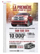 Le consommateur avisé lit les petits caractères : ‡, ^, √. Les o res de cette annonce s’appliquent à la livraison au détail des modèles neufs sélectionnés achetés auprès des concessionnaires participants à compter du 16 janvier 2015 et pendant le mois en cours seulement, et peuvent être modifiées ou prolongées sans préavis. Les frais de transport (1 695 $) et les frais sur le climatiseur (le cas échéant) sont compris dans le prix d’achat. Aucuns frais supplémentaires ne seront ajoutés aux prix tout inclus des véhicules annoncés. L’immatriculation, l’assurance, les droits sur les pneus neufs (15 $) et les taxes applicables sont en sus et seront exigés à l’achat. Un acompte peut être demandé. Le concessionnaire peut devoir échanger un véhicule (lorsque applicable), mais ne peut e ectuer de commandes. Le concessionnaire peut vendre ou financer à prix moindre. Voyez votre concessionnaire participant pour les détails et conditions. ‡ Les rabais totaux de 10 000 $ sont disponibles sur les nouveaux modèles Ram 1500 2014 (à l’exclusion des modèles à cabine simple) et consistent en une combinaison de 8 500 $ en remises au comptant déduites du prix négocié avant l’application des taxes et de 1 500 $ en boni au comptant de fidélisation et de conquête. ^ Le boni au comptant de fidélisation et de conquête de 1 500 $ sur les pick-up Ram est o ert aux clients admissibles à l’achat au détail d’un modèle Ram 1500 2014 sélectionné (à l’exclusion des modèles à cabine simple) ou d’un modèle Ram 2500/3500 2014 sélectionné et est déduit du prix négocié après l’application des taxes. Les clients admissibles sont les propriétaires actuels d’un pick-up Dodge ou Ram ou les propriétaires ou locataires actuels d’un pick-up d’un autre manufacturier. Le véhicule doit avoir été acheté ou loué par le client admissible et enregistré à son nom au plus tard le 3 janvier 2015. Une preuve de propriété ou d’entente de location sera exigée. Les travailleurs spécialisés agréés ou ceux qui suivent une formation de travailleurs spécialisés sont également admissibles. Ceci inclut les travailleurs agréés, les travailleurs certifiés et les clients qui terminent un certificat d’apprentissage. Une preuve de licence ou un certificat de travailleur spécialisé sera exigé. Certaines conditions s’appliquent. L’o re est valide pour le mois en cours seulement. √ Le rabais total consiste en une remise au comptant applicable uniquement sur les modèles Ram 2500/3500 2014 neufs équipés d’un moteur turbo diesel CumminsMD (ETK) sélectionnés (à l’exception des modèles châssis-cabine) : 9 345 $. Cette remise est déduite du prix négocié avant l’application des taxes. Certaines conditions s’appliquent. € A rmation « Le plus vendu au pays » basée sur l’étude de IHS Automotive: Polk sur les immatriculations de véhicules canadiens neufs jusqu’à août 2014 pour les grands camions diesel ayant un poids nominal brut (PNBV) de moins de 14 000 lb. ¥ Longévité basée sur les données IHS Automotive: Polk sur les véhicules canadiens en service au 1er juillet 2014 pour les camions diesel pleine grandeur 2500/250 et 3500/350 des années modèles 1994 à 2014. ≤ A rmation basée sur les camions 3500/350. Avec l’équipement approprié. Une tonne métrique = 2 200 livres. MC Le logo SiriusXM est une marque de commerce enregistrée de SiriusXM Satellite Radio inc. MD Cummins est une marque déposée de Cummins, inc. Coop publicitaire des concessionnaires Chrysler • Jeep® • Dodge • RAM