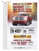 Le consommateur avisé lit les petits caractères : ‡, *, ± , **, °, ∧. Les o res de cette annonce s’appliquent à la livraison au détail des modèles neufs sélectionnés achetés auprès des concessionnaires participants à compter du 3 février 2015 et pendant le mois en cours seulement, et peuvent être modifiées ou prolongées sans préavis. Les frais de transport (1 695 $) et les frais sur le climatiseur (le cas échéant) sont compris dans le prix d’achat. Aucuns frais supplémentaires ne seront ajoutés aux prix tout inclus des véhicules annoncés. L’immatriculation, l’assurance, les droits sur les pneus neufs (15 $) et les taxes applicables sont en sus et seront exigés à l'achat. Un acompte peut être demandé. Le concessionnaire peut devoir échanger un véhicule (lorsque applicable), mais ne peut e ectuer de commandes dans le cas des modèles 2014. Le concessionnaire peut vendre ou financer à prix moindre. Voyez votre concessionnaire participant pour les détails et conditions. ‡ Le prix d’achat annoncé s’applique au modèle Ram 1500 SXT HEMIMD V8 Quad Cab 4X4 2015 (DS6L41 + 25A + AGR) : 28 495 $. Le prix d’achat comprend les frais de transport de 1 695 $, une remise au comptant et/ou un boni au comptant de fidélisation et de conquête. * Les remises au comptant sont o ertes sur certains modèles neufs 2015 sélectionnés et sont déduites du prix négocié avant l’application des taxes. Une remise au comptant de 8 000 $ est applicable sur les modèles Ram 1500 2015 sélectionnés (à l’exclusion des modèles Ram 1500 à cabine simple 4X2 et 4X4 2015, qui se qualifient pour une remise de 6 000 $). Voyez votre concessionnaire participant pour tous les détails. ± Un taux de financement à l’achat à partir de 3,49 % jusqu’à 96 mois est o ert aux clients admissibles sous réserve de l’approbation de crédit par la RBC Banque Royale, la Banque Scotia ou Financement auto TD et est applicable sur tous les modèles Ram 2015. Exemple : Ram 1500 SXT HEMIMD V8 Quad Cab 4X4 2015 (DS6L41 + 25A + AGR) avec un prix d’achat de 28 495 $ (incluant une remise au comptant de 8 000 $ et un boni au comptant de fidélisation et de conquête de 1 500 $), financé à un taux de 3,49 % pour 96 mois, sans aucun acompte (0 $), équivaut à 208 paiements aux deux semaines de 157,09 $, des frais de crédit de 4 179,72 $ et une obligation totale de 32 674,72 $. ** Prix de départ du modèle Ram 1500 Laramie Limited 4X2 2015 à cabine d’équipe (DS1R98 + 26M) montré, incluant une remise au comptant de 8 000 $ et 1 500 $ en boni au comptant de fidélisation et de conquête : 50 845 $. Les prix de départ des véhicules montrés incluent les remises/bonis au comptant et n'incluent pas les options (par exemple, certaines teintes de peinture). Les options sont disponibles moyennant des coûts additionnels. Les modèles montrés peuvent di érer légèrement des modèles qui sont commercialisés au Canada. ° Les rabais totaux allant jusqu’à 10 000 $ s’appliquent uniquement aux modèles Ram 1500 2014 neufs sélectionnés (à l'exclusion des modèles à cabine simple) achetés auprès des concessionnaires participants entre le 3 février 2015 et le 2 mars 2015 et consistent en une combinaison de 8 500 $ en remises au comptant (déduites du prix négocié avant les taxes) et de 1 500 $ en boni au comptant de fidélisation et de conquête. Certaines conditions s’appliquent. Dans la limite des stocks. Le concessionnaire peut devoir échanger un véhicule (lorsque applicable), mais ne peut e ectuer de commandes. Le concessionnaire peut vendre ou financer à prix moindre. Voyez votre concessionnaire participant pour les détails et conditions. ∧ Le boni au comptant de fidélisation et de conquête de 1 500 $ sur les camions Ram est o ert aux clients admissibles à l’achat au détail d’un modèle Ram 2014/2015 sélectionné (à l’exclusion des modèles à cabine simple 2014/2015, Ram 2500/3500 2015, Ram châssis-cabine 2015, Ram Promaster 2015 et fourgons utilitaires Ram 2015) et est déduit du prix négocié après l’application des taxes. Les clients admissibles sont les propriétaires actuels d'un camion Dodge ou Ram ou les propriétaires ou locataires actuels d'un camion d’un autre manufacturier. Le véhicule doit avoir été acheté ou loué par le client admissible et enregistré à son nom au plus tard le 3 février 2015. Une preuve de propriété ou d’entente de location sera exigée. Les travailleurs spécialisés agréés ou ceux qui suivent une formation de travailleurs spécialisés sont également admissibles. Ceci inclut les travailleurs agréés, les travailleurs certifiés et les clients qui terminent un certificat d’apprentissage. Une preuve de licence ou un certificat de travailleur spécialisé sera exigé. Certaines conditions s’appliquent. L’o re est valide pour le mois en cours seulement. ∆ Selon le segment des gros camions d'Automotive News. Données basées sur les estimations de consommation de carburant sur autoroute du programme ÉnerGuide 2015. Les méthodes d’essai utilisées sont celles du gouvernement du Canada. La consommation d’essence de votre véhicule varie selon vos habitudes de conduite et d'autres facteurs. Utiliser à des fins de comparaison seulement. E cacité allant jusqu’à 11,3 L/100 km (25 mi/gal) en ville et 8,0 L/100 km (35 mi/gal) sur route pour le modèle Ram 1500 Quad Cab 4X2 2015 HFE avec moteur V6 EcoDiesel de 3,0 L et transmission automatique à 8 vitesses. Voyez votre concessionnaire pour des précisions supplémentaires sur le programme ÉnerGuide. MC Le logo SiriusXM est une marque de commerce enregistrée de SiriusXM Satellite Radio inc. Coop publicitaire des concessionnaires Chrysler • Jeep® • Dodge • RAM