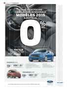 LES ACHETEURS AVISÉS LISENT LES PETITS CARACTÈRES. Les véhicules illustrés peuvent être dotés d’équipements offerts en option. Les concessionnaires peuvent vendre ou louer à prix moindre. Ces offres s’adressent à des particuliers admissibles uniquement, sur approbation du crédit par Crédit Ford. Certains clients pourraient ne pas être admissibles au taux d’intérêt annuel le plus bas. Un dépôt de sécurité pourrait être exigé par Crédit Ford selon les termes et conditions régissant le contrat de crédit du client. Ces offres excluent les frais d’immatriculation, les assurances, le plein de carburant, des frais maximum de RDPRM de 44 $ pour les véhicules loués plus des frais de services externes de 4 $, les droits spécifiques sur les pneus neufs, la TPS et la TVQ. Tous les prix et rabais sont appliqués à partir du prix de détail suggéré par le constructeur (PDSC). Pour obtenir tous les détails, consultez votre détaillant Ford, ou appelez le Centre des relations avec la clientèle Ford au 1 800 565-3673. Pour les commandes à l’usine, un client admissible peut se prévaloir des primes/offres promotionnelles de Ford en vigueur soit au moment de la commande à l’usine, soit au moment de la livraison, mais non des deux. Les offres des détaillants ne peuvent être combinées à l’assistance-compétitivité des prix, à la réduction de prix aux gouvernements, aux primes pour la location quotidienne, au programme d’encouragement aux modifications commerciales ou au programme de primes aux parcs commerciaux. * Jusqu’au 31 mars 2015, louez un véhicule Ford 2015 neuf parmi les modèles suivants : Fusion S à traction avant / Escape SE à traction avant équipé du moteur de 2,5 L et de l’ensemble de chargement utilitaire d’une valeur de 22 814 $ / 26 764 $ à un taux d’intérêt annuel de 0 % / 0 % pour un terme maximal de 48 / 48 mois sur approbation du crédit par Crédit Ford. Certains clients peuvent ne pas être admissibles au taux d’intérêt annuel le plus bas. La mensualité exigible, dans le cas où un acompte de 995 $ / 995 $ est versé ou qu’un véhicule d’une valeur équivalente est offert en échange, et déduction faite des rabais totaux de 1350 $ / 800 $ (les rabais totaux sont une combinaison du rabais du constructeur de 500 $ / 0 $ et de la contribution du concessionnaire de 850 $ / 800 $), et incluant les frais de transport et la taxe sur le climatiseur d’une valeur de 1 700 $ / 1 750 $, est de 259 $ / 280 $ pour une obligation locative totale de 13 427 $ / 14 435 $, et la valeur de rachat optionnel sera de 8 711,64 $ / 10 763,61 $. Les mensualités sont présentées à des fins de comparaison seulement et sont calculées comme suit : les mensualités son annualisées (multipliées par 12), puis divisées par la période de comparaison (26 pour les paiements aux deux semaines et 52 pour les paiements hebdomadaires). Par exemple, ([259 $ / 280 $] X 12) / 26 périodes de paiement = [119 $ / 129 $]), l’obligation totale locative est de 13 427 $ / 14 435 $, les frais de location sont de 0 $ / 0 $ ou 0 % / 0 %. Certaines conditions et une limite de kilométrage de 64 000 km / 64 000 km pendant 48 / 48 mois s’appliquent. Les frais de kilométrage excédentaire sont de 0,12 $ par km pour les modèles Fusion et Escape, plus les taxes en vigueur. †† © 2015 Sirius Canada Inc. « SiriusXM », le logo SiriusXM, de même que les noms et logos des stations sont des marques de commerce de SiriusXM Radio Inc. utilisées en vertu d’une licence. © 2015 Ford du Canada Limitée. Tous droits réservés.