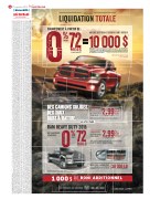 Le consommateur avisé lit les petits caractères : o, *, ± , **, ∧, √, ◊. Les o res de cette annonce s’appliquent à la livraison au détail des modèles neufs sélectionnés achetés auprès des concessionnaires participants à compter du 1er septembre 2015 et pendant le mois en cours seulement, et peuvent être modifiées ou prolongées sans préavis. Les frais de transport (1 695 $) et les frais sur le climatiseur (le cas échéant) sont compris dans le prix d’achat. Aucuns frais supplémentaires ne seront ajoutés aux prix tout inclus des véhicules annoncés. L’immatriculation, l’assurance, les droits sur les pneus neufs (15 $) et les taxes applicables sont en sus et seront exigés à l'achat. Un acompte peut être demandé. Le concessionnaire peut devoir échanger ou commander un véhicule (lorsque applicable). Le concessionnaire peut vendre à prix moindre. Voyez votre concessionnaire participant pour les détails et conditions. ° Les rabais totaux de 10 000 $ sont disponibles sur les nouveaux modèles Ram 1500 2015 sélectionnés (à l'exclusion des modèles à cabine simple) et consistent en une combinaison de 8 500 $ en remises au comptant (déduites du prix négocié avant l’application des taxes) et de 1 500 $ en boni au comptant de fidélisation et de conquête. Certaines conditions s’appliquent. Dans la limite des stocks. * Les remises au comptant sont o ertes sur certains modèles neufs 2015 sélectionnés et sont déduites du prix négocié avant l’application des taxes. Une remise au comptant de 8 500 $ est applicable sur les modèles Ram 1500 2015 sélectionnés (à l’exclusion des modèles Ram 1500 à cabine simple 4X2 et 4X4 2015, qui se qualifient pour une remise de 6 500 $). Voyez votre concessionnaire participant pour tous les détails. ± Les taux de financement à l’achat à partir de 0 % jusqu’à 72 mois et à partir de 2,99 % jusqu’à 96 mois (modèles Ram Heavy Duty 2500/3500 2015, à l’exclusion des modèles châssis-cabine, et modèles Ram 1500 2015, à l’exclusion des modèles à cabine simple) sont o erts aux clients admissibles sous réserve de l’approbation de crédit par la RBC Banque Royale, la Banque Scotia ou Financement auto TD et sont applicables sur certains modèles 2015 sélectionnés. Exemples : Ram 1500 Sport 4X4 2015 à cabine d’équipe (DS6S98 + 26L + MGB), avec un prix d’achat de 43 700 $ (incluant les rabais totaux allant jusqu’à 10 000 $, qui consistent en une combinaison de 8 500 $ en remises au comptant déduites du prix négocié avant les taxes et de 1 500 $ en boni de fidélisation et de conquête), financé à un taux de 0 %/2,99 % pour 72/96 mois sans aucun acompte (0 $), équivaut à 156/208 paiements aux deux semaines de 280,13 $/236,33 $, des frais de crédit de 0 $/5 456,64 $ et une obligation totale de 43 700 $/49 156,64 $. Ram 3500 Laramie 4X4 2015 à cabine d’équipe, roues arrière jumelées et moteur turbo diesel CumminsMD (D28P92 + 2EH + WLA), avec un prix d’achat de 63 905 $ (incluant une remise au comptant sur le moteur turbo diesel CumminsMD de 9 345 $ et un boni au comptant de fidélisation et de conquête de 1 500 $), financé à un taux de 0 %/2,99 % pour 72/96 mois sans aucun acompte (0 $), équivaut à 156/208 paiements aux deux semaines de 409,65 $/345,60 $, des frais de crédit de 0 $/7 978,80 $ et une obligation totale de 63 905 $/71 884,80 $. ** Prix de départ du modèle Ram 1500 Sport 4X4 2015 à cabine d’équipe (DS6S98 + 26L + MGB) montré, incluant les rabais totaux allant jusqu’à 10 000 $, qui consistent en une combinaison de 8 500 $ en remises au comptant (déduites du prix négocié avant les taxes) et de 1 500 $ en boni de fidélisation et de conquête : 43 700 $. Prix de départ du modèle Ram 3500 Laramie 4X4 2015 à cabine d’équipe, roues arrière jumelées et moteur turbo diesel CumminsMD (D28P92 + 2EH + WLA) montré, incluant une remise au comptant sur le moteur turbo diesel CumminsMD de 9 345 $ et un boni au comptant de fidélisation et de conquête de 1 500 $ : 63 905 $. Les prix de départ des véhicules montrés incluent les remises/bonis au comptant et n'incluent pas les options (par exemple, certaines teintes de peinture). Les options sont disponibles moyennant des coûts additionnels. Les modèles montrés peuvent di érer légèrement des modèles qui sont commercialisés au Canada. ^ Le boni au comptant de fidélisation et de conquête de 1 500 $ sur les camions Ram est o ert aux clients admissibles à l’achat au détail d’un modèle Ram 1500 2015 sélectionné (à l’exclusion des modèles à cabine simple), Ram 2500/3500 2014/2015, Ram châssis-cabine 2014/2015 ou d’un fourgon utilitaire Ram 2015 et est déduit du prix négocié après l’application des taxes. Les clients admissibles sont les propriétaires actuels d'un camion Dodge ou Ram ou les propriétaires ou locataires actuels d'un camion d’un autre manufacturier. Le véhicule doit avoir été acheté ou loué par le client admissible et enregistré à son nom au plus tard le 1er septembre 2015. Une preuve de propriété ou d’entente de location sera exigée. Les travailleurs spécialisés agréés ou ceux qui suivent une formation de travailleurs spécialisés sont également admissibles. Ceci inclut les travailleurs agréés, les travailleurs certifiés et les clients qui terminent un certificat d’apprentissage. Une preuve de licence ou un certificat de travailleur spécialisé sera exigé. Certaines conditions s’appliquent. L’o re est valide pour le mois en cours seulement. √ Le rabais total consiste en une remise au comptant applicable uniquement sur les modèles Ram 2500/3500 2015 neufs équipés d’un moteur turbo diesel CumminsMD (ETK) sélectionnés (à l’exception des modèles châssis-cabine) : 9 345 $. Cette remise est déduite du prix négocié avant l’application des taxes. Certaines conditions s’appliquent. Voyez votre concessionnair